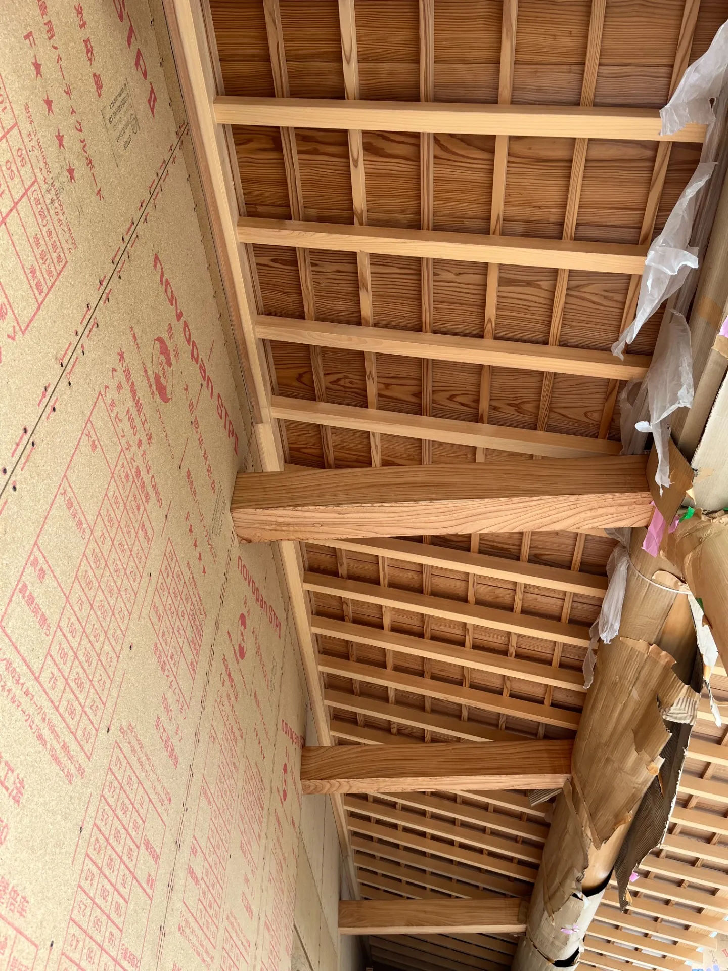室内では、和の趣を取り込んだ 化粧梁の天井 の施工が進んでおり、木目の美しさが空間全体の印象を引き上げています。