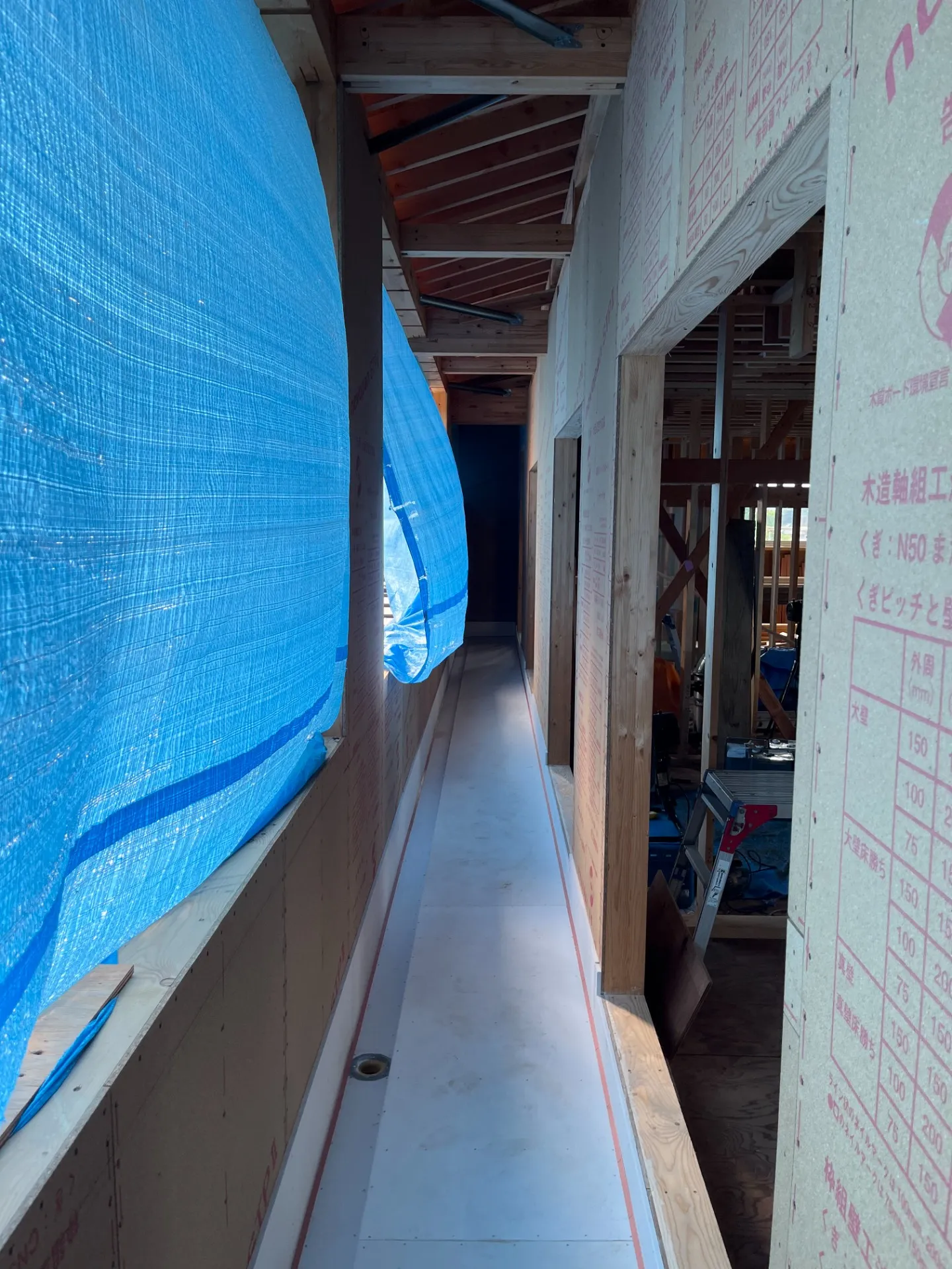写真のとおり、今回の住まいの特徴のひとつでもある 深い軒先(約90cm) の造作が進み、軒裏の下地が見えてきました。